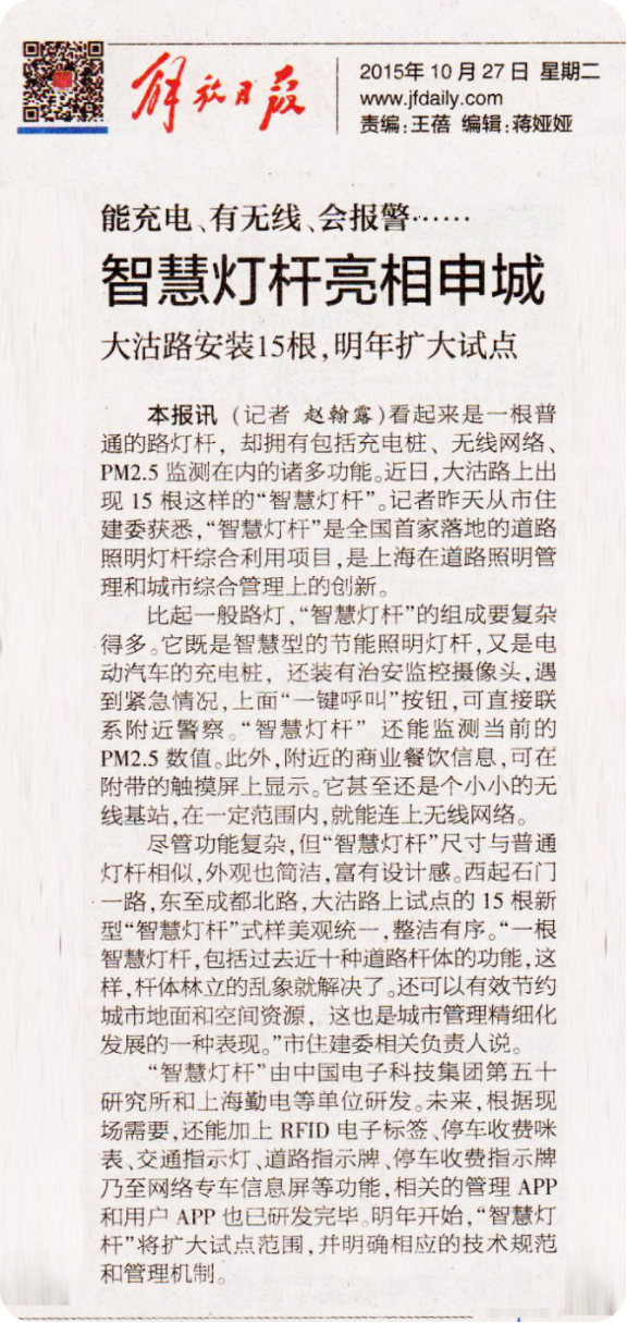 解放日報:能充電(diàn)、有(yǒu)無線、會(huì)報警 智慧燈杆亮相申城